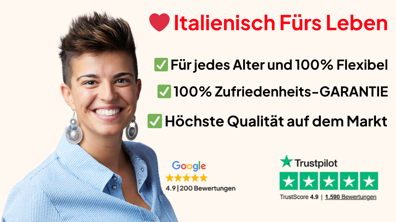 • Höchste Qualität: Wir garantieren, dass unsere Programme die qualitativ hochwertigsten und effektivsten italienischen Lernprogramme auf dem Markt sind, da sie speziell von uns (100% muttersprachlichen italienischen Speziallehrern) NUR für deutschsprachige Lernende entwickelt wurden! (Wenn Du das nicht glaubst, sieh Dir einfach unsere 500+ Trustpilot- und Google-Bewertungen an)